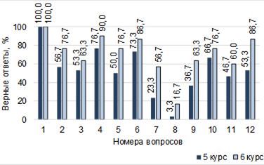 Рисунок 2 – Сравнительный анализ правильных ответов студентов 5–6 курсов медицинского института на вопросы анкеты по ключевым вопросам внебольничной пневмонии
