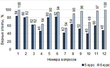 Ответили правильно, выбрав ответ под пунктом 1 98% студентов 6 курса, получив оценку «отлично» и 60% студентов 5 курса, что соответствует критерию «удовлетворительно» (p < 0,001).