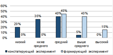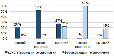 В рамках когнитивного компонента экологической компетентности нами были изучены уровни сформированности экологической картины мира у студентов. Анализ двух экспериментов показал положительную динамику в формировании экологической картины мира. В формирующем эксперименте мы видим значительное повышение числовых показателей на уровнях выше среднего (60%) и высокого (18%) (рис. 1).