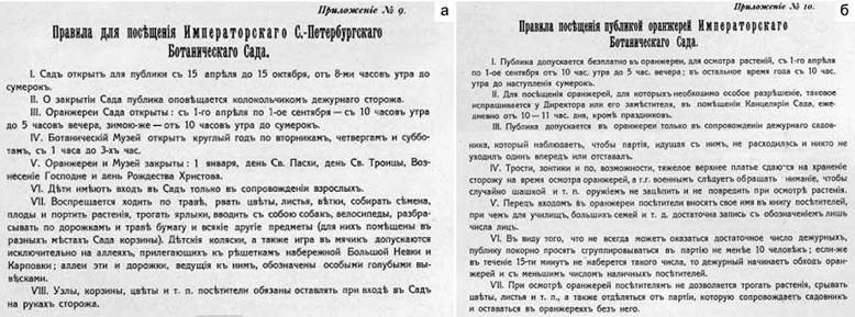 В инструкции Императорскому Ботаническому Саду, утвержденной Главноуправляющим землеустройством и земледелием от 20 ноября 1909 г. в §20 упоминается назначение Сада в сфере популяризации знаний: 1) «давать своими коллекциями понятие публике о растительности различных стран земного шара, о продуктах растений и вообще о их значении для человека; 2) возбуждать интерес и содействовать распространению в публике знаний о растениях – как путём частных объяснений, так и устраиваемых время от времени публичных лекциях; 3) теми же средствами, а также примером знакомить публику с усовершенствованными приёмами культуры растений и распространять сведения в этом отношении» [12, с. 296]. Посещение Императорского Ботанического Сада регламентировалось правилами – приложения № 9 и 10 (рис. 1: а, б).