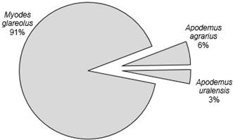 В результате проведенных двухгодичных исследований нами было отловлено 89 грызунов, относящихся к трем видам: рыжая полевка Myodes glareolus Schreb., полевая мышь Apodemus agrarius Pall. и малая лесная мышь Apodemus uralensis Pall. Относительно низкая численность выявленных видов может быть связана с общей депрессией численности микромаммалий в годы исследований, а также косвенно свидетельствовать об антропогенном прессе обследованных участков дубравы.