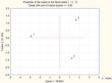 Полученные данные подверглись обработке средствами пакета EcoDat [3, с. 102] и программы Statistica 6.0 Для проведения факторного анализа и графического представления результатов исследований использовался метод главных компонент (Principal Components Analysis, PCA) [4, с. 286].