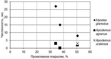 Из приведенного рисунка следует, что микротинные грызуны в изученных нами растительных ассоциациях тяготеют к местам с умеренными показателями проективного покрытия, не превышающими 50% (от 35 до 50, в среднем чуть более 40%).