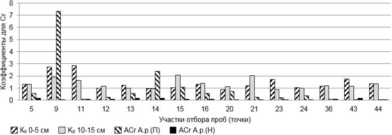 Рисунок 1 – Относительные концентрации хрома в почве (Kₒ) и растениях (АCr A. cristatum)