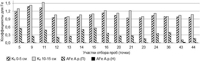 Рисунок 4 – Относительные концентрации железа в почве (Kₒ) и растениях (АFe A. cristatum)