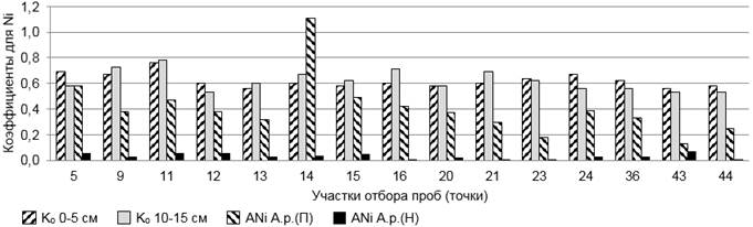 Рисунок 6 – Относительные концентрации никеля в почве (Kₒ) и растениях (АNi A. cristatum)