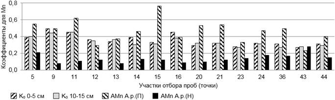 Рисунок 7 – Относительные концентрации марганца в почве (Kₒ) и растениях (АMn A. cristatum)