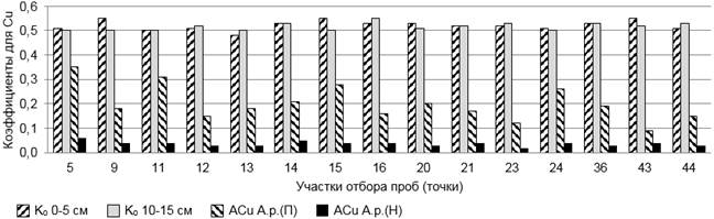 Рисунок 8 – Относительные концентрации меди в почве (Kₒ) и растениях (АCu A. cristatum)