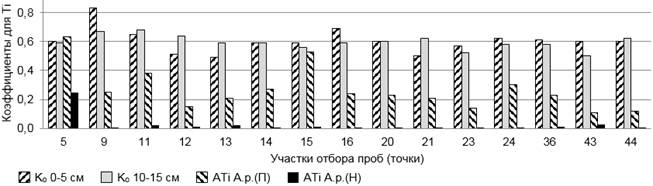 Рисунок 9 – Относительные концентрации титана в почве (Kₒ) и растениях (АTi A. cristatum)