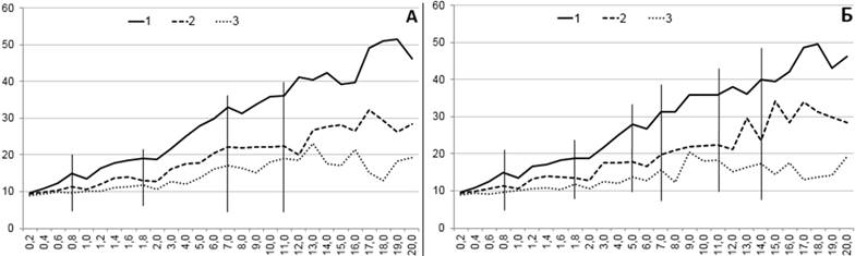 Рисунок 1 – Вклад в суммарную дисперсию растительности осей главных компонент в зависимости от размера блока для степных экосистем Троицкого заказника (по оси ординат – вклад оси, %; по оси абсцисс – размер блока, м; 1, 2, 3 – номера осей, вертикальными линиями отмечены уровни мозаичности). А и Б – варианты объединения блоков в независимых противоположных направлениях