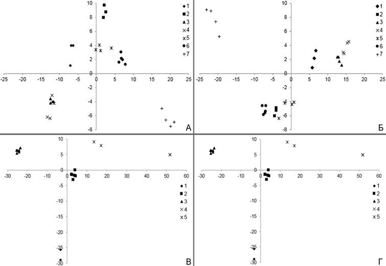 Рисунок 2 – Ординация мозаик степей (7 м – А, Б и 11 м – В, Г) в пространстве показателей фиторазнообразия (А, В) и в пространстве осей НМШ и фитоиндикационных шкал (Б, Г). На графиках показаны первые две дискриминантные оси