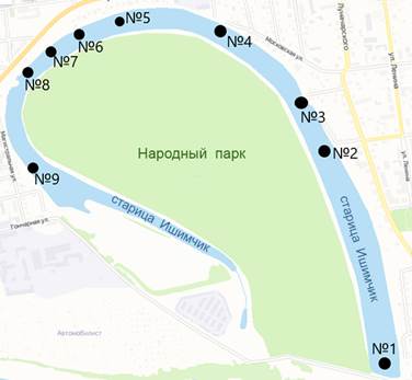 Рисунок 1 – Места пробоотбора старицы Ишимчик
