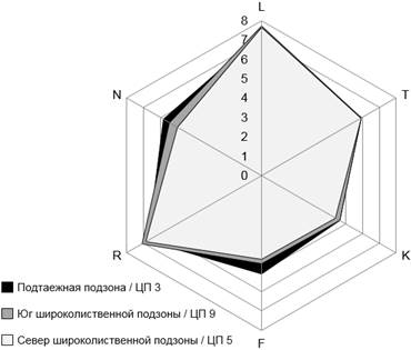 Рисунок 1 – Характеристика местообитаний Trifolium repens L. в разных ландшафтных подзонах Республики Татарстан. Примечание: L – освещенность, T – температурный режим, K – континентальность климата, F – влажность почвы, R – кислотность почвы, N – богатство почвы минеральным азотом