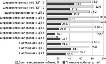 Доля генеративных побегов в ЦП T. repens варьирует от 21 до 100%. При этом на севере широколиственной подзоны в ЦП со сравнительно низкой плотностью (ЦП 5–8) отмечается наибольшее участие генеративных побегов (более 85%), остальные – вегетативные. На юге широколиственной подзоны и в подтаежной подзоне при сравнительно высокой плотности побегов доля генеративных побегов снижается до 50–75%. Больше всего вегетативных побегов в ЦП 4 под пологом березняка неморально-травяного в связи низкой освещенностью.