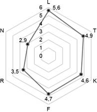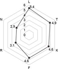 Рисунок 1 – Фрагмент экологического ареала растительных сообществ с участием C. cibarius в южнотаежной подзоне (А) и подтаёжной зоне (Б) (по шкалам Элленберга (1974), где: L – шкала освещенности/затенения, балл; Т – термоклиматическая шкала, балл; K – шкала континентальности климата, балл; F – шкала увлажнения почв, балл; R – шкала кислотности почв, балл; N – шкала богатства почв азотом, балл