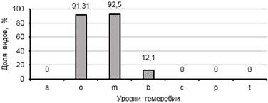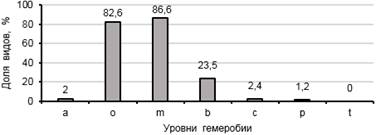 Виды в исследованных сообществах южнотаежной подзоны представлены в основном высоко- и среднечувствительными к антропогенному воздействию (о – 82,6%, m – 86,6%, b – 23,5%). В большинстве исследованных сообществ не отмечено видов с низкой чувствительностью к антропогенному воздействию (p – 1,2%). К невыносящим антропогенного влияния (a – агемеробам) относится 2%. Виды, переносящие регулярные и сильные нарушения (с – α-эугемеробы), составляют 2,4%. Метагемеробных видов (t) не выявлено, то есть нет видов полностью деградировавших экосистем и искусственных сообществ (рис. 2). Индекс гемеробиальности, рассчитанный для изученных сообществ, составил от 0,05 до 0,33. Средняя доля антропотолерантных видов составляла 13,23%, а доля антропофобных видов составляла 86,77%.