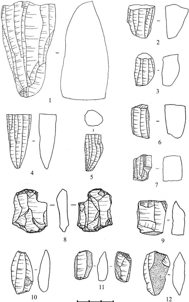 Пять резчиков из шести обработаны ретушью со спинки. Они имеют прямой рабочий край (рис. 5: 21, 22). Резчик на узкой (0,5 см) кремневой пластинке имеет четыре рабочих лезвия, по одному на каждом углу пластинки. Все лезвия имеют прямой рабочий край, обработанный как ретушью со спинки, так и с ретушью с брюшка (рис. 5: 23).