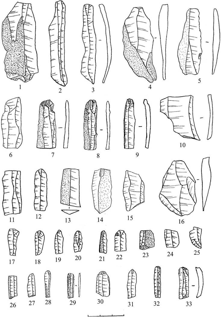 Рисунок 3 – Евстюниха I. Ножевидные пластины без ретуши (1–33)