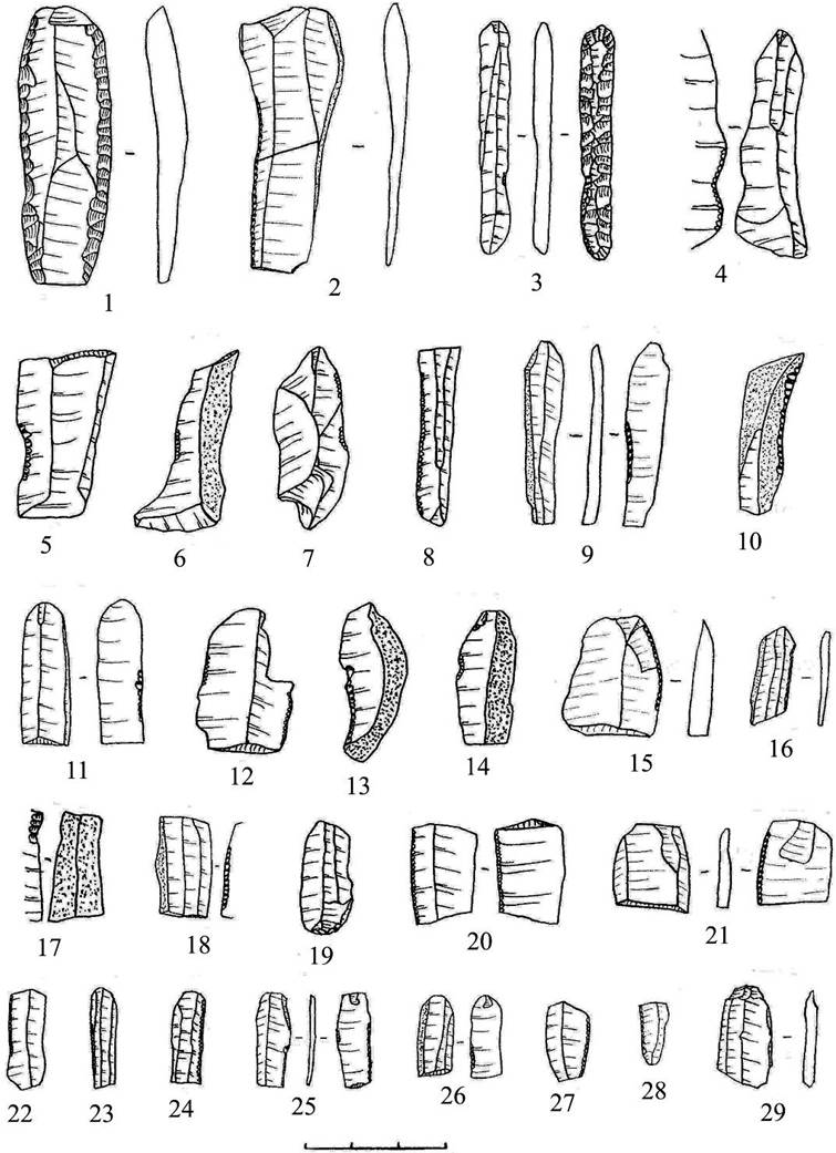 Рисунок 4 – Евстюниха I. Ножевидные пластины с ретушью (1–29)