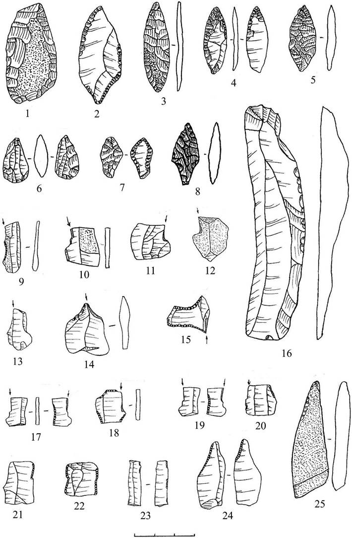 Рисунок 5 – Евстюниха I. Каменные изделия (1–8 – наконечники стрел; 9–13 – резцы; 14, 15, 17–20 – резцы-резчики; 16 – комбинированное орудие; 21–23 – резчики; 24, 25 – острия)