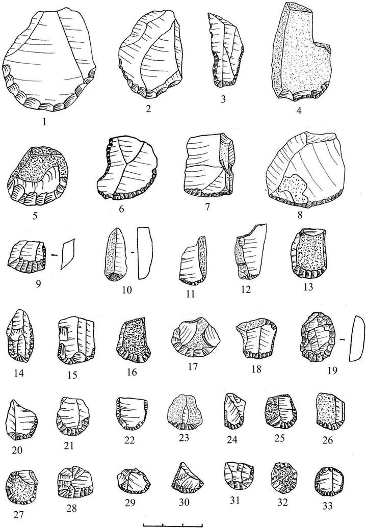 Для изготовления скребков на пластинах отбирались пластины шириной 1,1–1,7 см (рис. 6: 3, 10–12, 15, 26, 33). Лезвия все скребков обработаны ретушью со спинки. На четырех скребках присутствует плиточная корка. Самый маленький скребок обработан ретушью по всему периметру, что придало ему круглую форму диаметром 1,4 см (рис. 6: 33).