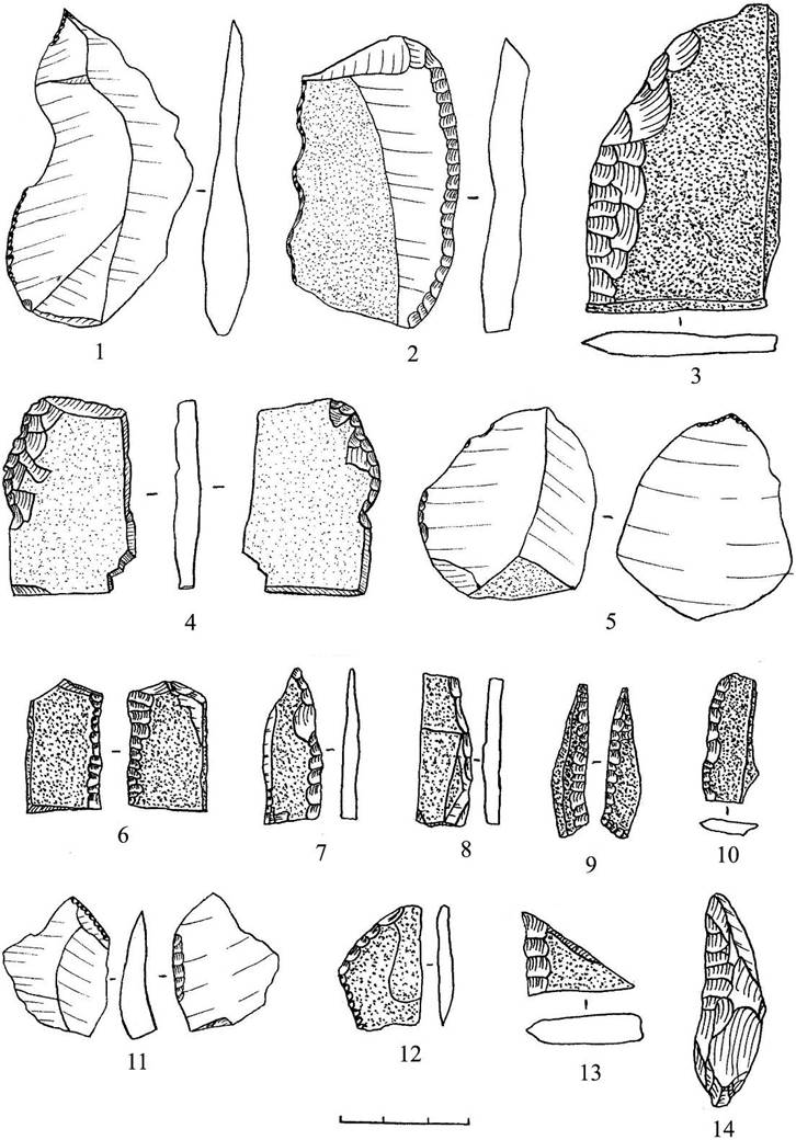 Рисунок 7 – Евстюниха I. Отщепы с краевой ретушью (1, 2, 5, 11) и заготовки орудий (3, 4, 6–10, 12–14)