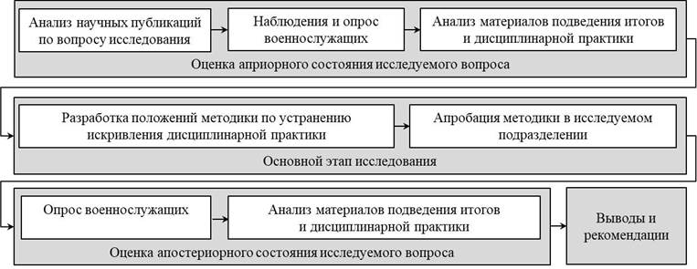 Для проведения исследования определимся с несколькими важными терминами. Во-первых, сформулируем термин «искривление (искажение, перекос) дисциплинарной практики» – это форма неуставных взаимоотношений военнослужащих, заключающаяся в нарушении или невыполнении методики (порядка) применения командиром дисциплинарной власти. Во-вторых, определение «устранение искривления дисциплинарной практики» будем понимать как проведение совокупности мероприятий, направленных на удержание в рамках соответствия требованиям общевоинских уставов дисциплинарной власти командира подразделения. При проведении данного исследования авторы использовали методы наблюдения за состоянием воинской дисциплины в подразделении, опроса военнослужащих, анализа документов и дисциплинарной практики, а также синтеза методики работы командира подразделения по устранению искривления дисциплинарной практики. Работа проводилась в соответствии со схемой исследования (рис. 1).