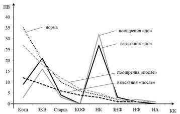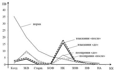 Результаты исследования дисциплинарной практики (ДП) контрольной (КГ) и экспериментальной групп (ЭГ) «до» и «после» применения рассмотренной Методики отображены в виде диаграмм ДП (рис. 2). На горизонтальных осях диаграмм были отмечены категории командиров (КК), участвовавших в дисциплинарной практике исследуемых подразделений, а на вертикальных осях – количество примененных ими дисциплинарных взысканий и поощрений (ВП). Обе полученные диаграммы имеют очевидные отклонения по сравнению с кривой «норма» (это кривая, отражающая одну из основных закономерностей применения дисциплинарной практики: чем младше командир, тем больше поощрений и дисциплинарных взысканий он применяет) в левых двух третях диаграммы. Выявленные отклонения диаграмм ДП имеют схожие закономерности распределения дисциплинарных взысканий и поощрений в КГ и в ЭГ. Указанные отклонения отмечаются у следующих категорий командиров: командир отделения (КОтд.), старшина роты (Старш.) и курсовой офицер-преподаватель (КОФ) – недостаточная ДП (провалы диаграммы), а у категорий: командир учебной группы (КУГ) и начальник курса (НК) – избыточная ДП (всплески диаграммы). В правой трети обоих диаграмм распределение ДП отражается в рамках нормы. Также необходимо заметить, что в КГ командир подразделения при использовании дисциплинарной власти в области поощрений действует в рамках нормы (рис. 2: А), но не курирует работу младших командиров при ведении ДП. Его коллега в ЭГ также не вникает в особенности ДП сержантов (рис. 2: Б), однако старается компенсировать это своей «переработкой» в вопросах ДП. Реализация ДП с точки зрения дисциплинарных взысканий имеет похожую закономерность распределения взысканий в обеих исследуемых группах (рис. 2).