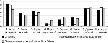Средние значения по каждой из 8 октант у студентов и преподавателей входят в интервал адаптивной выраженности от 0 до 8 баллов. В группе студентов ведущим фактором является «авторитарный», затем идут «дружелюбный» и «альтруистический». У преподавателей со стажем работы до 10 лет ведущим фактором также является «авторитарный», затем идут «альтруистический» и «дружелюбный». Преподаватели со стажем от 11 до 20 лет ведущими факторами выделяют «дружелюбный» и «альтруистический», третий ведущий фактор – «авторитарный». Таким образом, во всех исследуемых группах значимыми являются адаптивно выраженные факторы: «авторитарный», «альтруистический» и «дружелюбный». Л.Н. Собчик так трактует адаптивную выраженность. «Авторитарный» фактор: уверенный в себе человек, но не обязательно лидер, упорный и настойчивый, «альтруистический» фактор: ответственный по отношению к людям, деликатный, мягкий, добрый, эмоциональное отношение к людям проявляет в сострадании, симпатии, заботе, ласке, умеет подбодрить и успокоить окружающих, бескорыстный и отзывчивый. «Дружелюбный»: склонный к сотрудничеству, кооперации, гибкий и компромиссный при решении проблем и в конфликтных ситуациях, стремится быть в согласии с мнением окружающих, сознательно конформный, следует условностям, правилам и принципам «хорошего тона» в отношениях с людьми, инициативный энтузиаст в достижении целей группы, стремится помогать, чувствовать себя в центре внимания, заслужить признание и любовь, общительный, проявляет теплоту и дружелюбие в отношениях [20]. Для удобства изучения данные представлены в виде диаграммы на рисунке 1.
