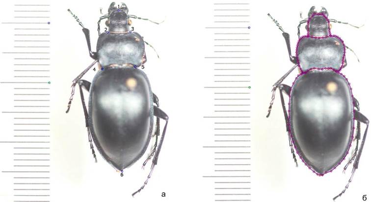 Форма жуков изучалась с применением геометрической морфометрии [11]. Каждый экземпляр был смонтирован и оцифрован путем фотографирования в горизонтальной проекции. Для анализа формы была разработана система меток и аутлайнов, огибающих голову, переднеспинку и надкрылья. Метки расставлялись по принципу биологической гомологии в наиболее характерных местах [12]: первая метка находится на переднем крае головы, вторая и третья – на переднем крае переднеспинки на границе с головой, четвёртая и пятая – в основании надкрылий, где они соприкасаются с переднеспинкой, шестая метка находится на вершине сомкнутых надкрылий (рис. 1: а).