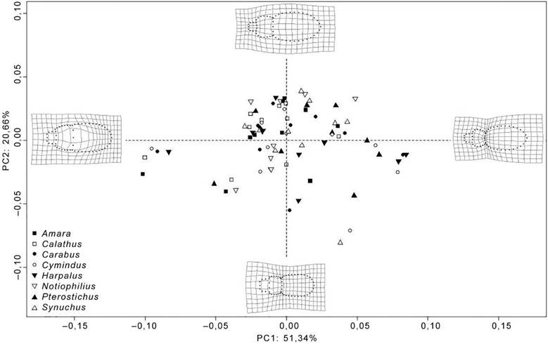 По итогам прокрустова анализа координат меток было сформировано морфопространство, представленное на рис. 2. На плоскости отображены значения двух первых главных компонент, крайним значениям которых соответствуют вариации формы жужелиц, визуализированные с помощью трансформационных решеток. При уменьшении значений первой главной компоненты (51,3% общей изменчивости формы) задняя часть тела укорачивается, а задний край переднеспинки заметно расширяется, при этом уменьшается глубина перетяжки между переднеспинкой и надкрыльями. Вторая главная компонента (20,6%) отражает форму головы и переднеспинки: при уменьшении значений голова становится более широкой, а максимальная ширина переднеспинки сдвигается ближе к голове.