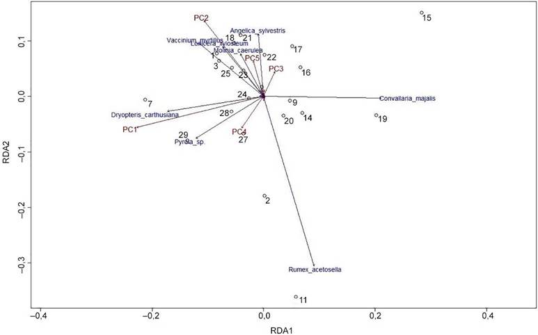 Для визуализации результатов анализа избыточности была построена ординационная диаграмма, на которой точками отображены пробные площади, а стрелками – переменные формы и предикторы (рис. 3). Длина стрелок отражает степень влияния конкретной переменной, а направление указывает на скоррелированность переменных. Первая ось RDA1 отражает 58,8% объясненной изменчивости пробных площадей по форме отловленных на них жужелиц. Эта ось скоррелирована с первой главной компонентой формы жужелиц PC1, а также представленностями Convallaria majalis L., Dryopteris carthusiana Vill. и Pyrola sp. Таким образом, на пробных площадках с доминированием в травянистом ярусе Convallaria majalis L. преобладают жужелицы, форма которых соответствует отрицательным значениям по первой главной компоненте морфопространства, то есть жуки с относительно короткими надкрыльями и широкой переднеспинкой. Напротив, на пробных площадках с высокой представленностью Dryopteris carthusiana Vill. и Pyrola sp. преобладают жужелицы, форма которых соответствует положительным значениям первой главной компоненты морфопространства, то есть жуки с длинными надкрыльями, узкой переднеспинкой и выраженной перетяжкой между основаниями надкрыльев и переднеспинкой. Вторая ось ординации RDA2 отражает 28,1% изменчивости пробных площадей по форме жужелиц, она сильно скоррелирована со второй главной компонентой морфопространства жужелиц PC2 и представленностью Rumex acetosella, в меньшей степени – с представленностями Vaccinium myrtillus L., Lonicera xylosteum L., Molinia caerulea L., Angelica sylvestris L. Таким образом, на пробных площадках с доминированием в травянистом ярусе Rumex acetosella преобладают жужелицы, форма которых соответствует отрицательным значениям по второй главной компоненте морфопространства, то есть жуки с широкой головой и относительно короткой переднеспинкой. В свою очередь, на пробных площадках с высокой представленностью Vaccinium myrtillus L., Lonicera xylosteum L., Molinia caerulea L., Angelica sylvestris L. преобладают жужелицы, форма которых соответствует положительным значениям второй главной компоненты морфопространства, то есть жуки с узкой головой.