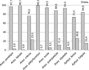 На рис. 1 показаны усредненные данные соотношения растительных и животных объектов в питании уток на Байкале за три сезона года – весна-лето-осень. Как видно, соотношение этих групп кормов различается у разных видов птиц. Тем не менее по характеру питания их можно условно разделить на три трофические группы: 1) фитофаги (свиязь и касатка), 2) преимущественно фитофаги (кряква, шилохвость) и 3) зоофитофаги (чирок-свистунок, чирок-трескунок, широконоска, красноголовый нырок, хохлатая чернеть). У птиц первой группы, фитофагов, растительный корм составляет в рационе более 95% по объему желудка, у преимущественно фитофагов – более 80%, зоофитофагов – менее двух третьей части (60–70%).