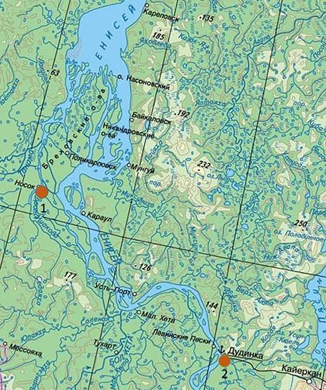 Рисунок 1 – Район исследования авторов (2017–2019): 1 – тундра в окрестностях поселка Носок (70°16ʹ c.ш., 82°34ʹ в.д.); 2 – лесотундра в окрестностях города Дудинка (69°24ʹ c.ш., 86°10ʹ в.д.)