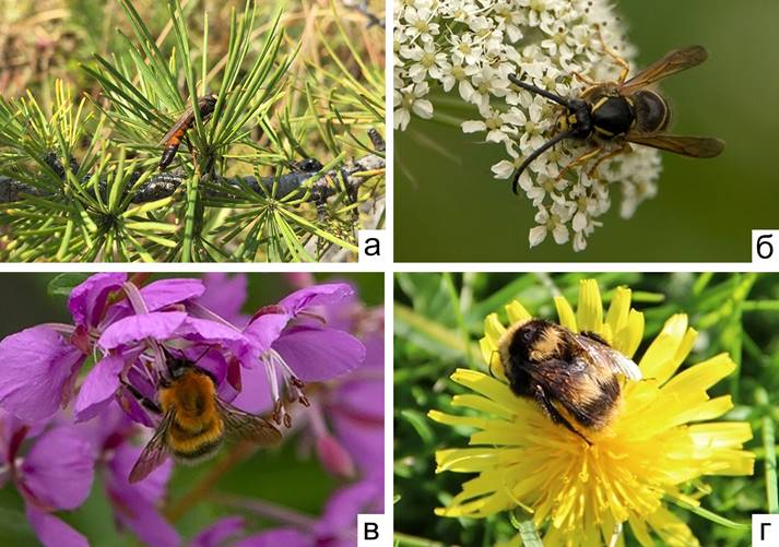 Рисунок 2 – Перепончатокрылые (Hymenoptera) Приенисейской Сибири: а – рогохвост большой Urocerus gigas на лиственнице сибирской Larix sibirica L.; б – оса обыкновенная Vespula vulgaris на купыре лесном Anthriscus sylvestris L.; в – шмель северный Bombus hyperboreus на кипрее узколистном Chamerion angustifolium L.; г – шмель полярный Bombus polaris на одуванчике рогоносном Taraxacum ceratophorum L.