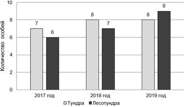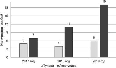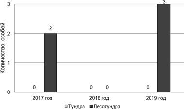 Рисунок 4 – Численность Urocerus gigas в тундре и лесотундре Приенисейской Сибири (2017–2019 гг.)