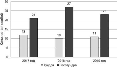 Рисунок 6 – Численность Bombus hyperboreus в тундре и лесотундре Приенисейской Сибири (2017–2019 гг.)