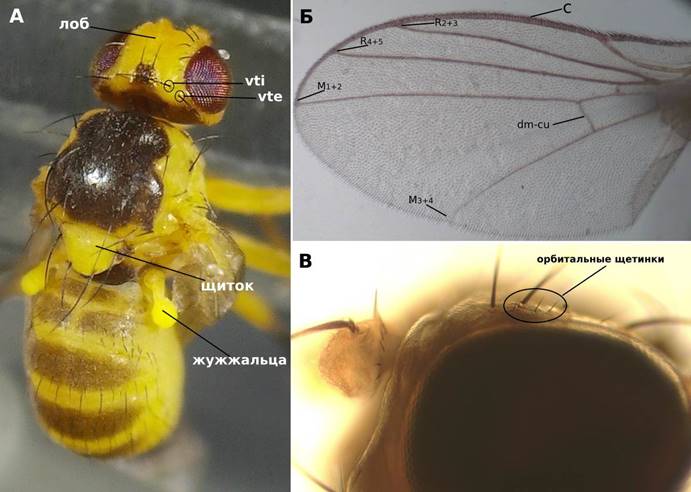 Рисунок 1 – Отличительные особенности имаго рода Liriomyza. А – внешние строение (желтая окраска щитка и черная окраска спины); Б – строение крыла (костальная жилка достигает до M₁₊₂); В – наклоненные назад орбитальные щетинки