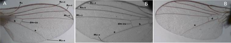 Рисунок 2 – Разновидности крыльев минных мух. А – L. sativae; Б – L. bryoniae; В – L. brassicae