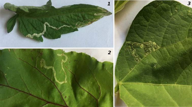 Рисунок 3 – Типы мин. 1 – мины L. sativae на листе Solanum lycopersicum; 2 – мины L. bryoniae на листе Beta vulgaris; 3 – мины L. brassicae на листе Phaseolus vulgaris