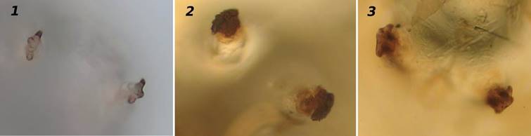 Рисунок 4 – Расположение задних дыхалец у куколок минирующих мух. 1 – L. sativae; 2 – L. bryoniae; 3 – L. brassicae
