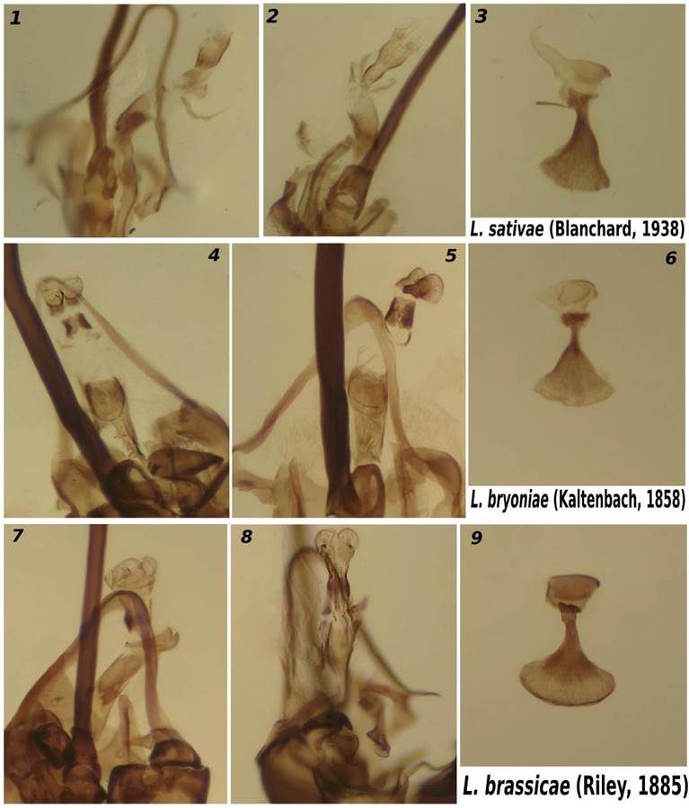 Рисунок 5 – Дистифаллус отдельных видов Liriomyza (увеличение ×100): 1 – L. sativae, вид сбоку; 2 – L. sativae, дорсовентральная проекция; 3 – L. sativae, семенная помпа; 4 – L. bryoniae, дорсовентральная проекция; 5 – L. bryoniae, вид сбоку; 6 – L. bryoniae, семенная помпа; 7 – L. brassicae, вид сбоку; 8 – L. brassicae, дорсовентральная проекция; 9 – L. brassicae, семенная помпа
