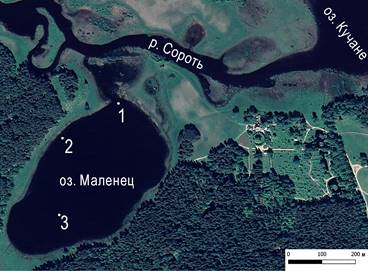Исследования проводили на озере Маленец в раннелетний период 2017 г. на трех заданных станциях (рис. 1).