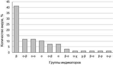 Для определения уровня органического загрязнения и степени антропогенной нагрузки на биогеоценозы озера Маленец был проведен сапробиологический анализ. Из всех обнаруженных микроводорослей 68 видовых таксонов (78,2%) являлись видами-индикаторами органического загрязнения воды и относились к 12 группам сапробионтов. Доминировали бета-мезосапробионты, включающие 28 видов и составляющие 41,2% от общего числа видов-индикаторов (рис. 2). Это позволяет отнести воды озера Маленец к бета-мезосапробной зоне самоочищения. Микроводоросли, предпочитающие чистые воды (олигосапробионты), составляли 10,3%, загрязненные (альфа-мезосапробионты) – 7,4%. На переходные формы приходился в совокупности 41,1%.