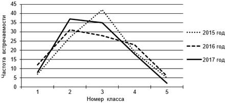 Рисунок 1 – Кривые распределения массы семян C. maximowiczii в 2015–2017 гг