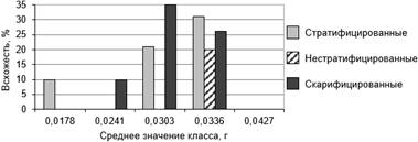 Наибольшая всхожесть семян C. maximowiczii отмечена у скарифицированных и стратифицированных образцов со средними значениями массы и составила 35% для скарифицированных семян со средним значением массы 0,0303 г и 31% для стратифицированных экземпляров со средним значением массы 0,0427 г. Образцы с наибольшими значениями массы семян (0,0427 г) и со значениями массы семян ниже среднего (0,0178 г) не дали всходов или всхожесть была незначительная вне зависимости от проведения предпосевной подготовки. Всхожесть нестратифицированных проб отмечена только у семян четвертого класса (0,0427 г) и составила 20% (рис. 3).