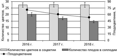 У растений C. maximowiczii в условиях Кольского полуострова образуются плоды правильной формы, без значительных повреждений. Характеристика плодоцветения представителей растений C. maximowiczii в условиях интродукции за трехлетний период (2016–2018 гг.) обнаружила стабильность, отклонение от среднего значения в разные годы составило ±6,7% (рис. 4).