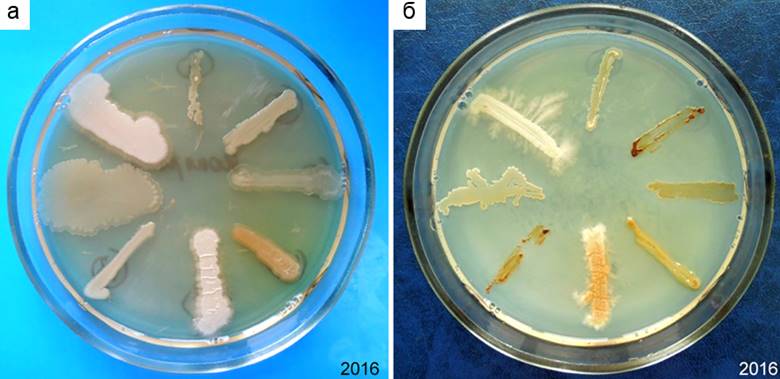 Рисунок 2 – Рост выделенных штаммов термофильных бактерий на среде YK без добавления металлов (контроль) (a) и с добавлением Pb²⁺ 2500 мг/л (б)