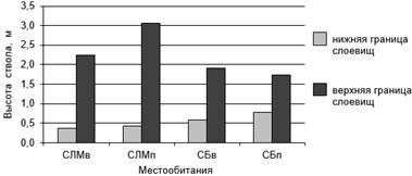 На рисунке 1 можно видеть, что в СЛМ верхняя граница поселения слоевищ P. furfuracea на возвышении ниже, чем в понижении (критерий Вилкоксона-Манна-Уитни, P = 0,001). В СБ верхние границы на возвышении и в понижении не различаются (P > 0,05). Верхняя граница распространения слоевищ по стволу сосны зависит от верхней границы пластинчатой корки в СЛМ как на возвышении (rS = 0,44; P = 0,03), так и в понижении (rS = 0,55; P = 0,005), в СБ эта связь не выявлена (P > 0,05). На рисунке 1 показано изменение нижней границы поселения слоевищ. Сравнение по этому показателю 4-х местообитаний (дисперсионный анализ, критерий Шеффе) показало, что СЛМв не отличается от СЛМп (P = 0,6), отличается от СБв и СБп (P = 4,6 × 10⁻⁶ и P = 1,4 × 10⁻¹⁵ соответственно); СЛМп отличается от СБв и СБп (P = 0,001 и P = 2,0 × 10⁻¹² соответственно). В целом прослеживается увеличение нижней границы поселения слоевищ от наиболее сухого СЛМв к более влажному СБп. Влажность воздуха и освещенность изменяются с высотой над поверхностью почвы. Относительная влажность воздуха максимальна на высоте 0–0,5 м по сравнению с выше расположенными участками ствола, на этой же высоте ствола отмечены минимальные значения освещенности [21]. Влагоемкость корки Pinus strobus L. различается в зависимости от высоты над поверхностью почвы, она больше в нижней части ствола [22]. Очевидно, в более освещенном сосняке корка в комлевой части менее влажная и слоевища P. furfuracea поселяются на стволе ниже, в менее освещенных и влажных местообитаниях – выше.