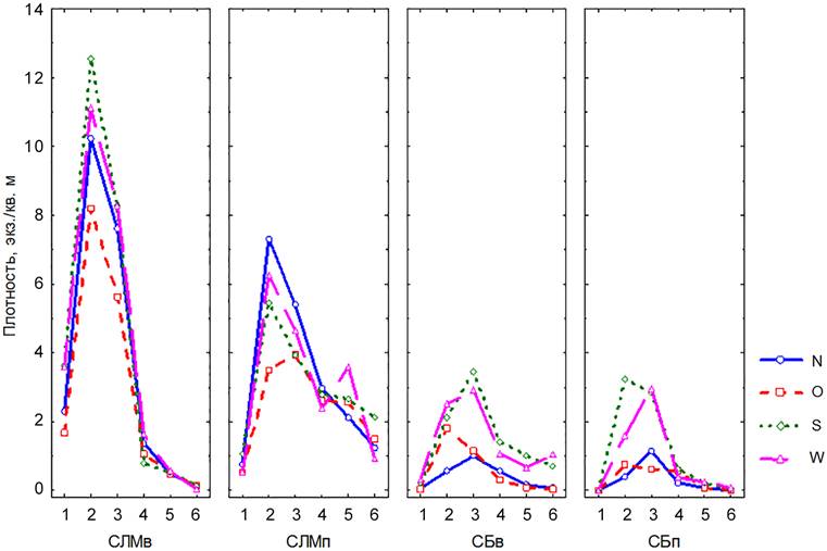 Рисунок 3 – Плотность популяции D₂ на разных высотах и экспозициях в сосняках